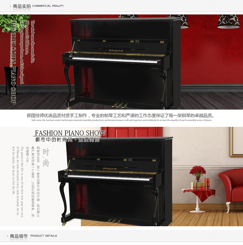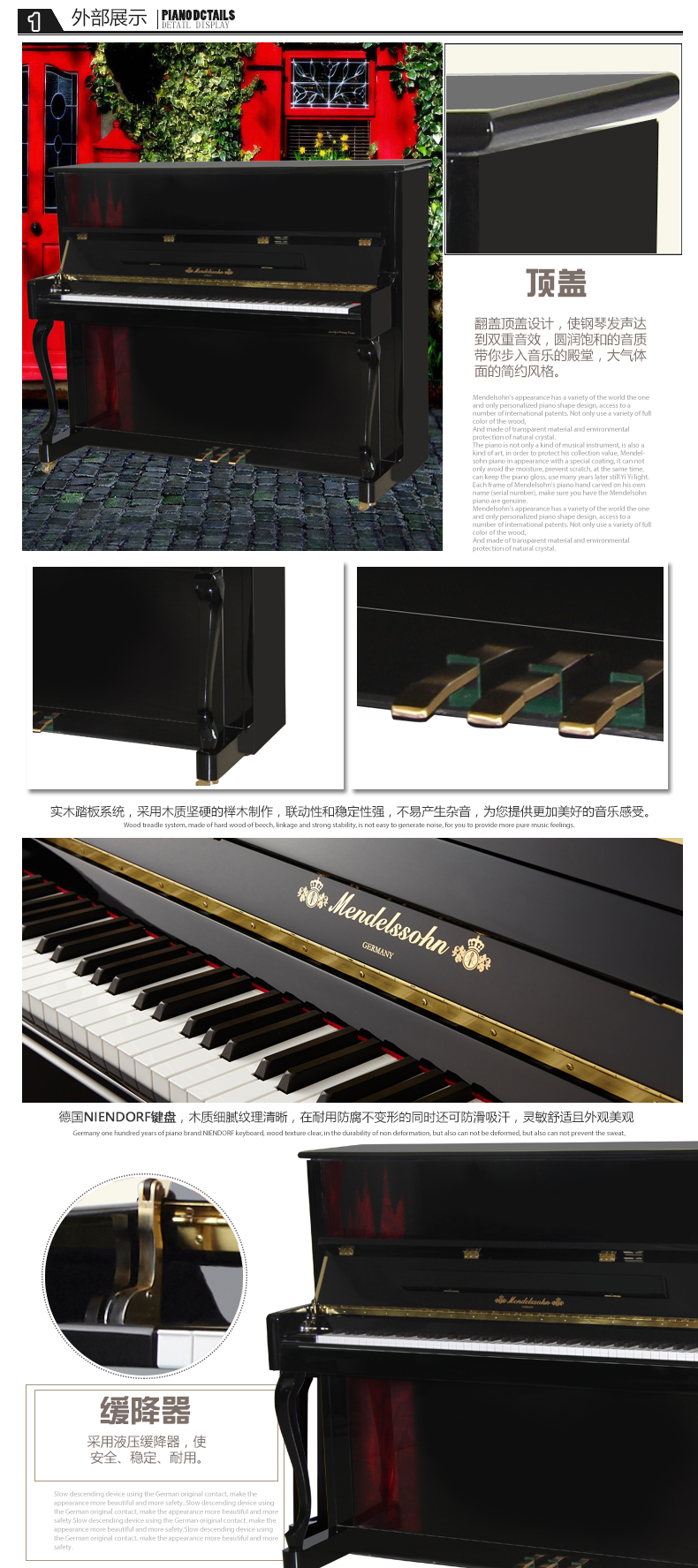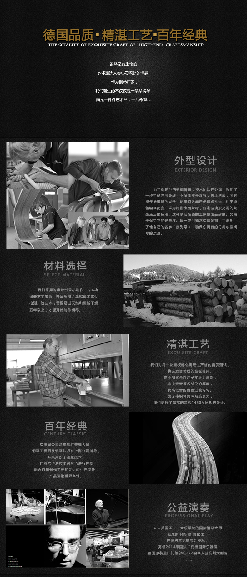 采用彰顯尊貴的歐式外型設(shè)計,精選高品質(zhì)材質(zhì),雅致外觀與超凡音質(zhì)相結(jié)合。德國高級技師手工組裝制作,專業(yè)的制琴工藝和嚴謹 的工作態(tài)度保證了每一架進口系列鋼琴的卓越品質(zhì)。同時,每一架進口系列鋼琴在出廠時都須經(jīng)過嚴格的檢驗、調(diào)試、整理,保證每位 使用者都能感受到它的純真的音質(zhì)。