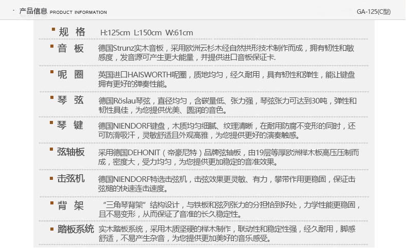弦軸板:采用德國DEHONIT(帝豪尼特)品牌弦軸板,由19層等厚歐洲櫸木板高壓壓制而成,密度大,受力均勻,為您提供更加穩(wěn)定 的音準效果。