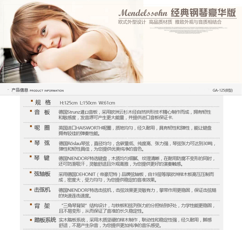 背架:獨(dú)有的 “三角琴背架”專利結(jié)構(gòu)設(shè)計(jì),與鐵板和弦列張力的分擔(dān)恰到好處,力學(xué)性能更穩(wěn)固,且不易變形,從而保證了音準(zhǔn)的長久穩(wěn)定性。