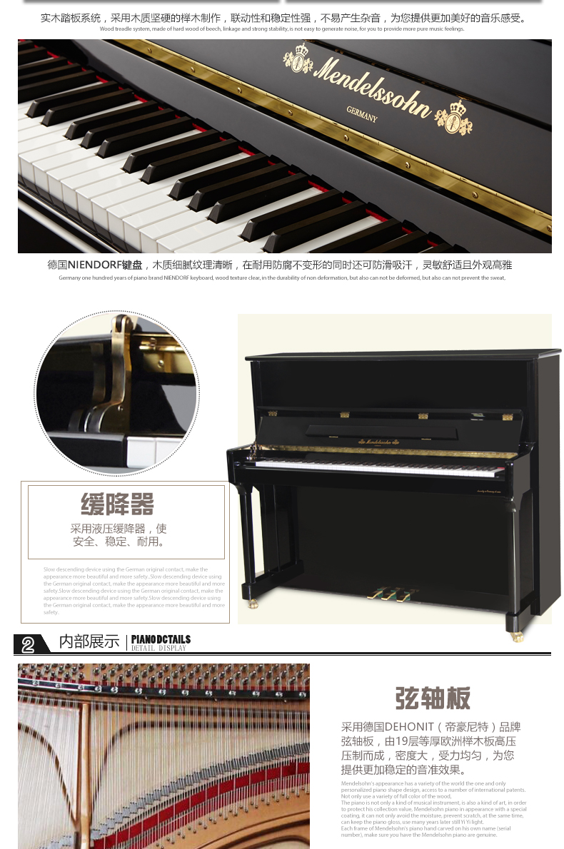 踏板系統(tǒng):實木踏板系統(tǒng),采用木質(zhì)堅硬的櫸木制作,聯(lián)動性和穩(wěn)定性強,經(jīng)久耐用,腳感舒適,不易產(chǎn)生雜音,為您提供更加純凈的音樂感受。