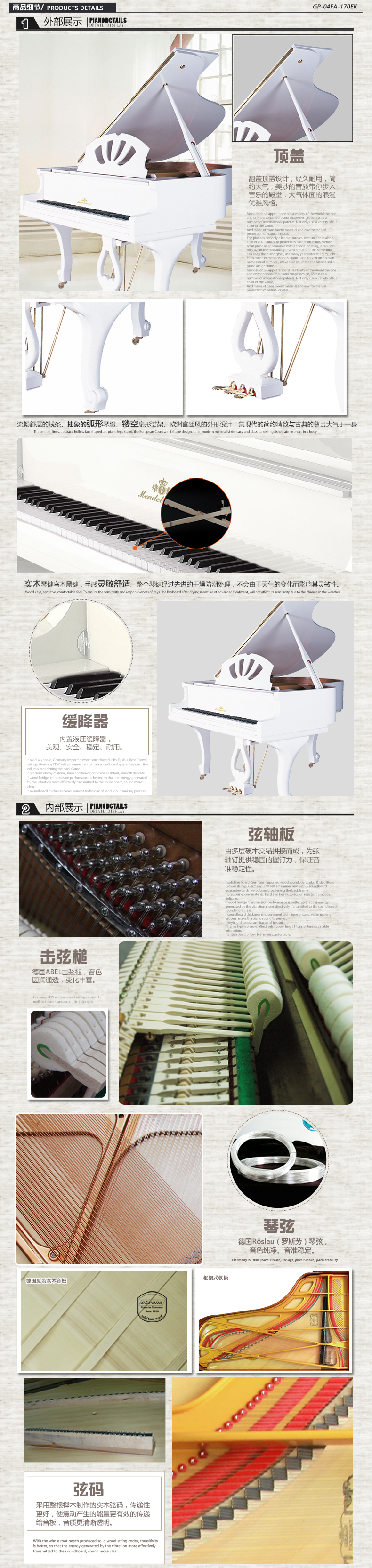 1.榔頭:采用德國ABEL擊弦槌,具有出色的彈力,令音色更加優(yōu)美