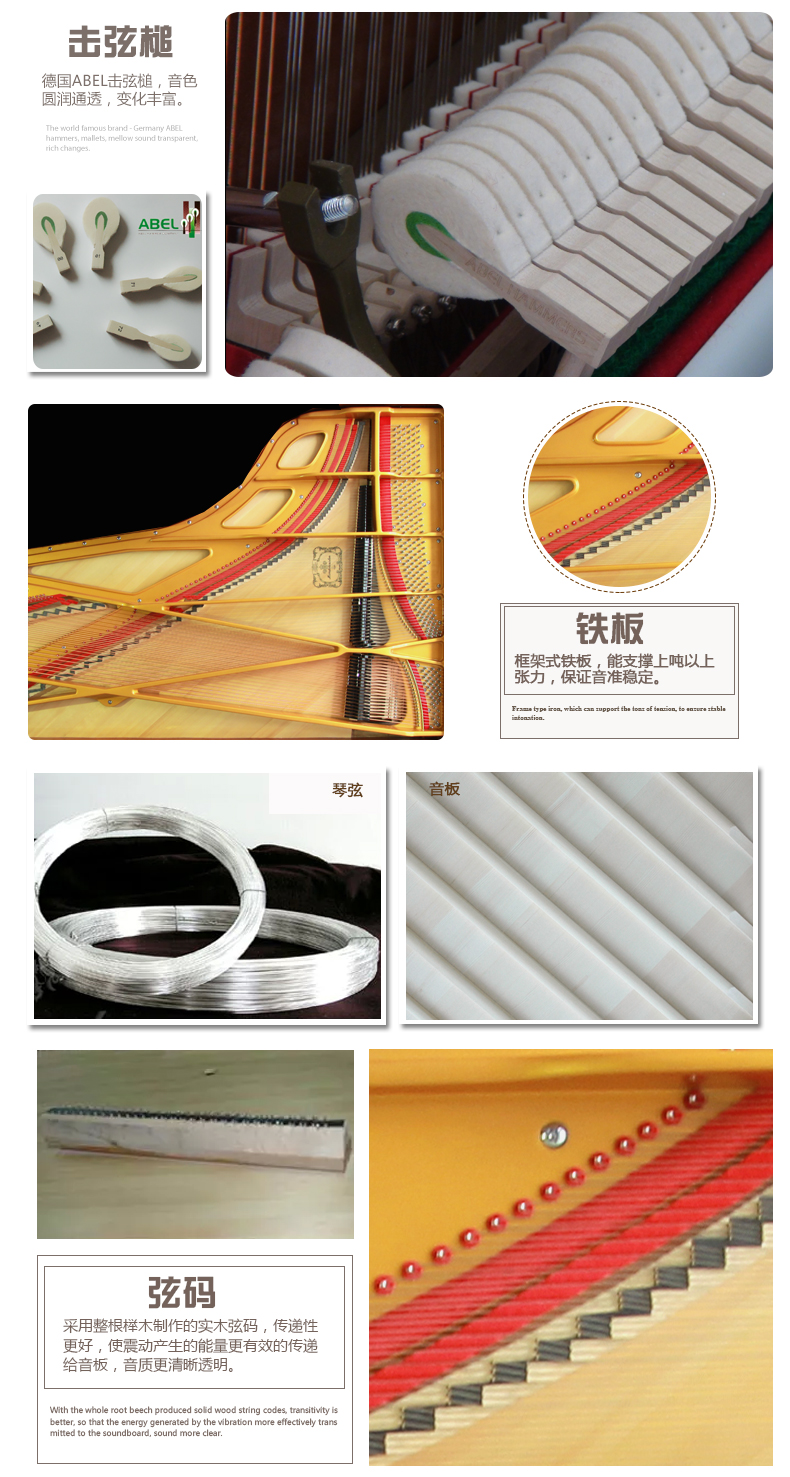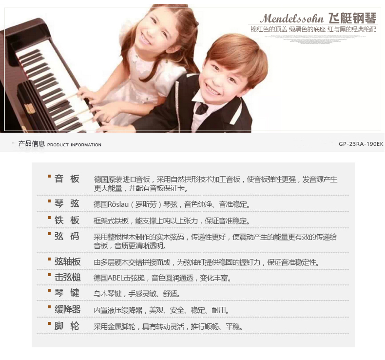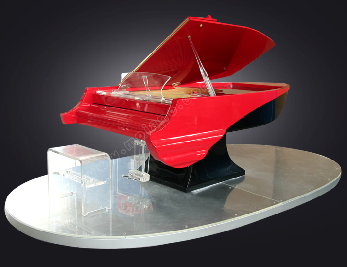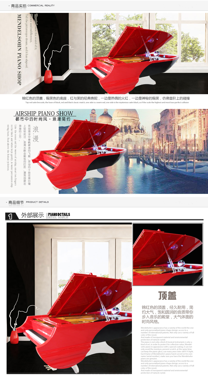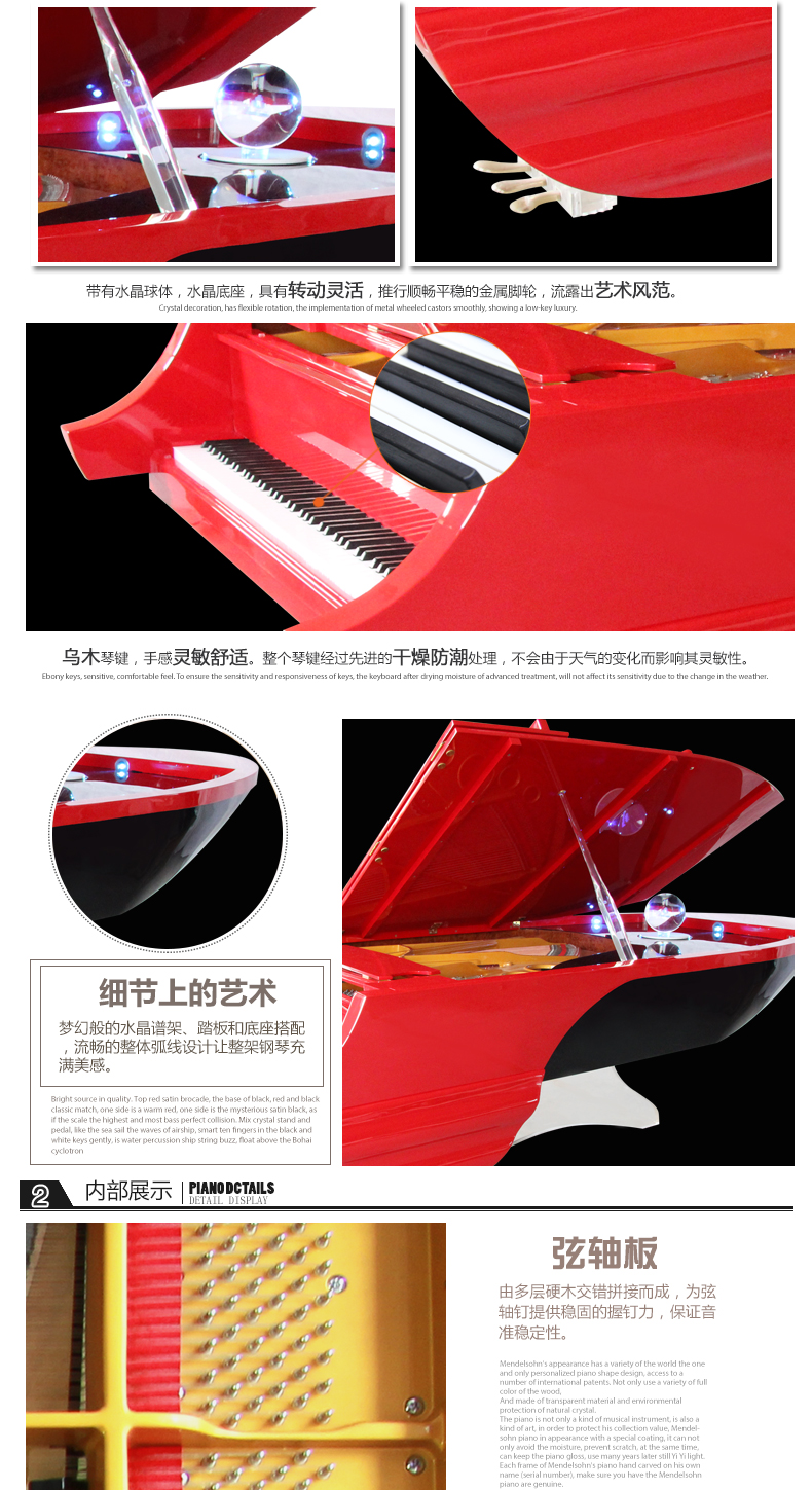 璀璨源于品質,尊貴源于細節(jié),奢華亮麗的飛艇外觀設計,錦紅色的頂蓋、段黑色的底沿,與夢幻般的水晶譜架、踏板和底座相搭配,流暢的整體弧線設計讓整架鋼琴充滿美感。