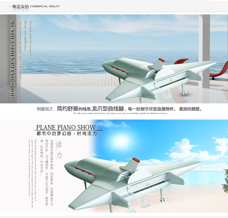 “飛機”鋼琴的設(shè)計理念源自人們對于理想的追求,展現(xiàn)了現(xiàn)代科技與未來的 延伸。當(dāng)激揚優(yōu)越的琴聲響起,閉目聆聽,仿佛置身于無垠的天際,