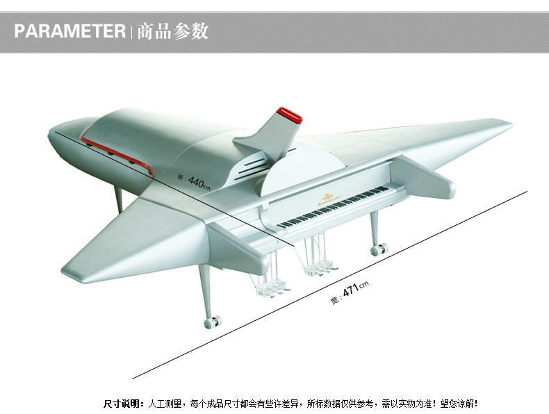 推出了第三款“飛機”概念琴。該琴長440厘米,寬471厘米。為了增加視覺上的觀感,我們在鋼琴88鍵的基礎(chǔ)上加設(shè)了39個不動鍵,使整體效果更加
