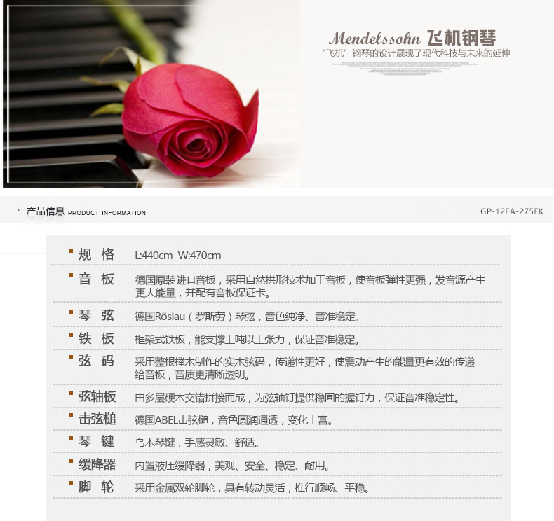 德國工藝純手工制作,簡潔的彎月形譜架,線條流暢的音色金屬琴腿,夢幻般的水晶踏板,搭配銀灰色飛機形體琴身,使整架鋼琴更加充滿時尚感